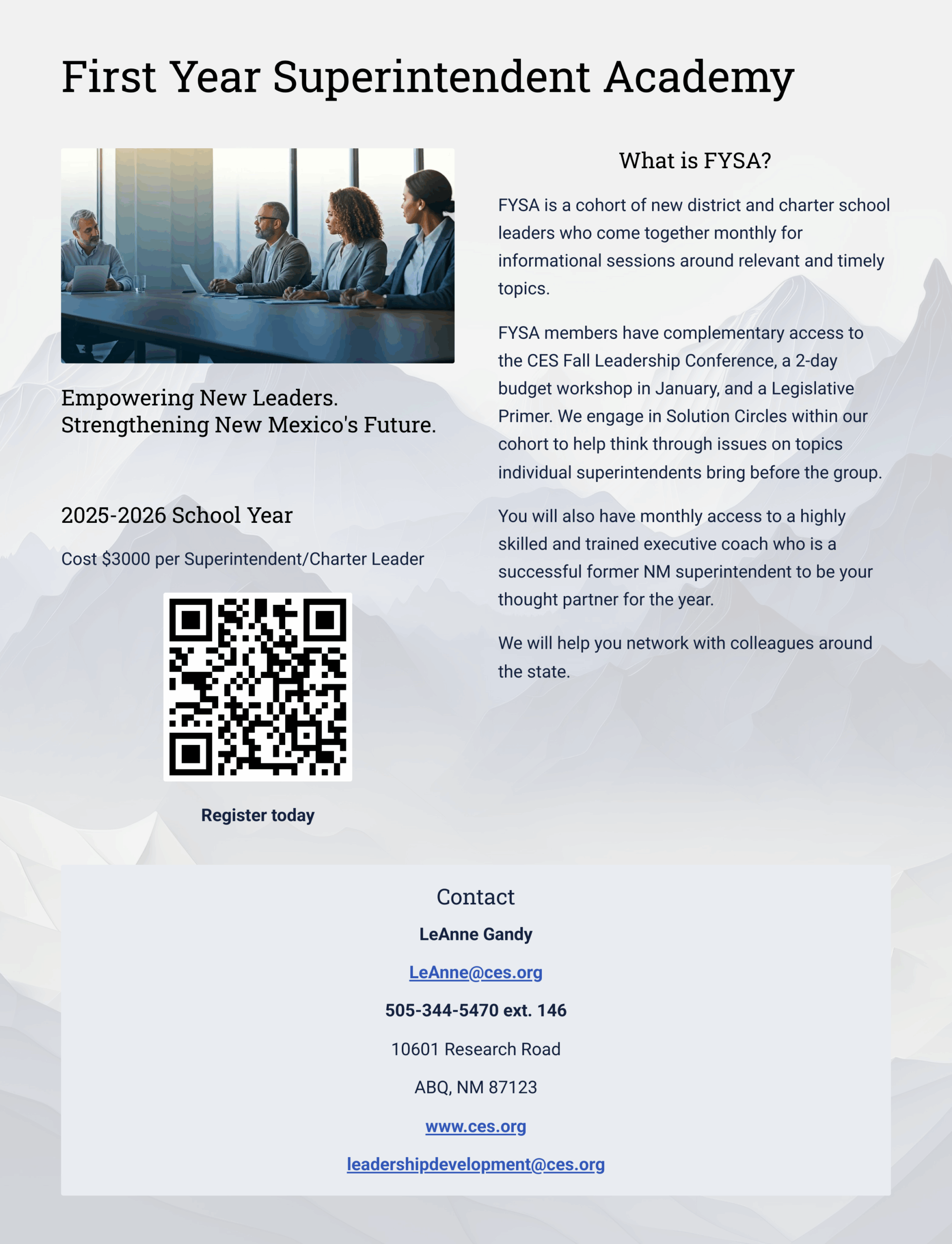CES has designed this year-long academy to focus on strategic, relevant content alongside powerful interactions and networking opportunities with educational and legislative leaders across the state. High-intensity executive coaching and quarterly learning opportunities will further support new superintendents throughout their first year as they support students in their district.